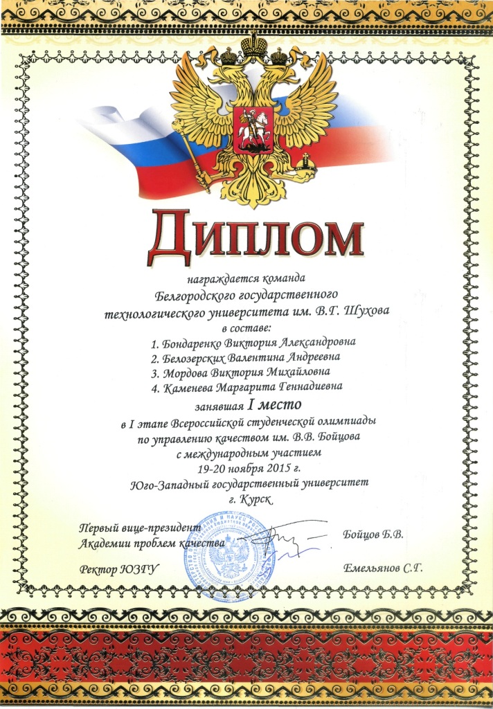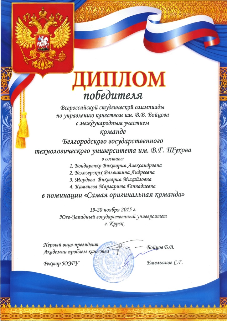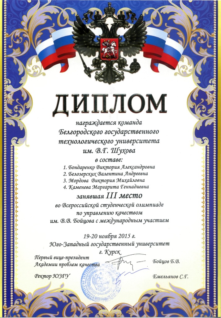 Команда кафедры «Стандартизация и управление качеством» в составе Белозерских В.А., Бондаренко В.А. и Мордовой В.М. – студенток группы УК-41 под руководством и в сопровождении профессора кафедры СиУК Пучка О.В. приняла участие во Всероссийской студенческой олимпиаде по управлению качеством им. В.В. Бойцова (с международным участием), проводимой в Юго-Западном университете с 18 по 20 ноября 2015 г. в г. Курске.