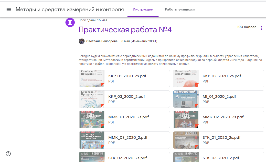 В современных условиях, при необходимости соблюдения карантинных мероприятий, информационные технологии стали повседневным атрибутом процесса обучения. Одним из интересных (в плане широких возможностей) путей организации занятий в дистанционной форме является многим известная платформа Google Classroom. Она объединяет широкий спектр полезных сервисов и инструментов Google, организованных специально для учёбы. Такими возможностями пользуется для проведения своих занятий ст. преподаватель Белоброва Светлана Александровна.