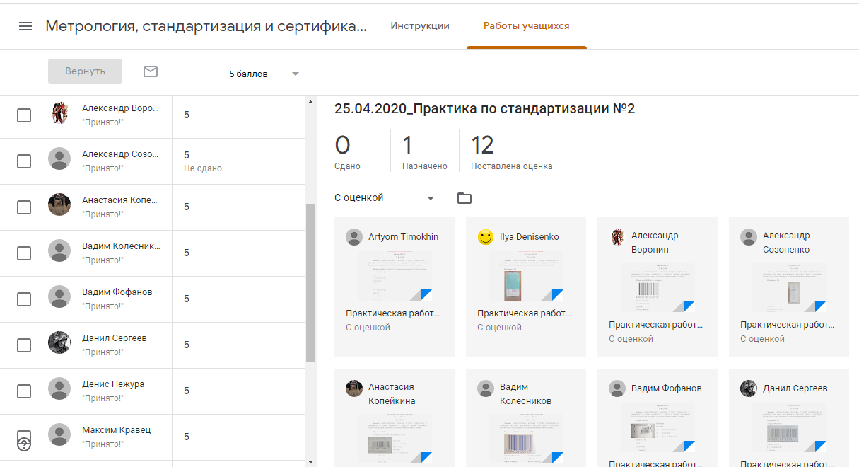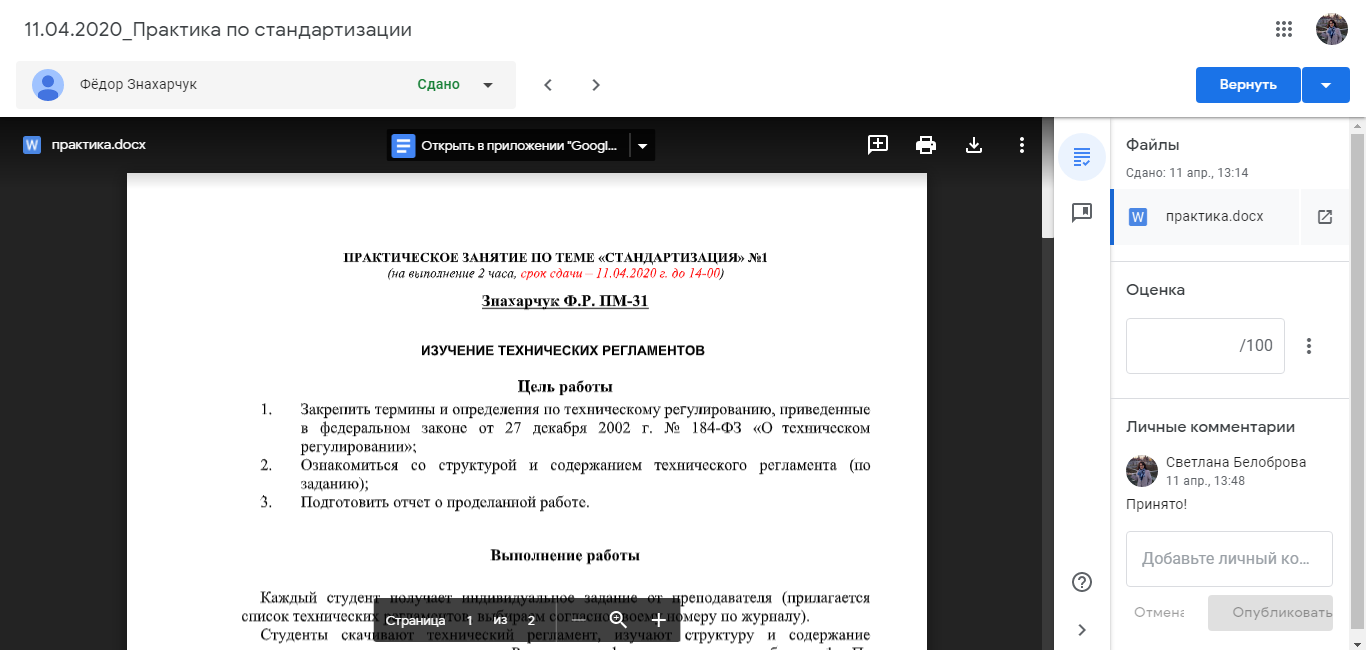 Прикрепляя выполненные задания, студенты не видят работы друг друга. Светлана Александровна оценивает выполненные работы, при необходимости вносит правки и комментарии по тексту работы, возвращает задание на доработку. Также данный сервис позволяет отслеживать общий прогресс всей группы на курсе.