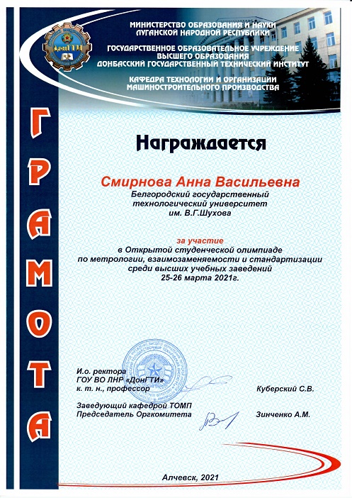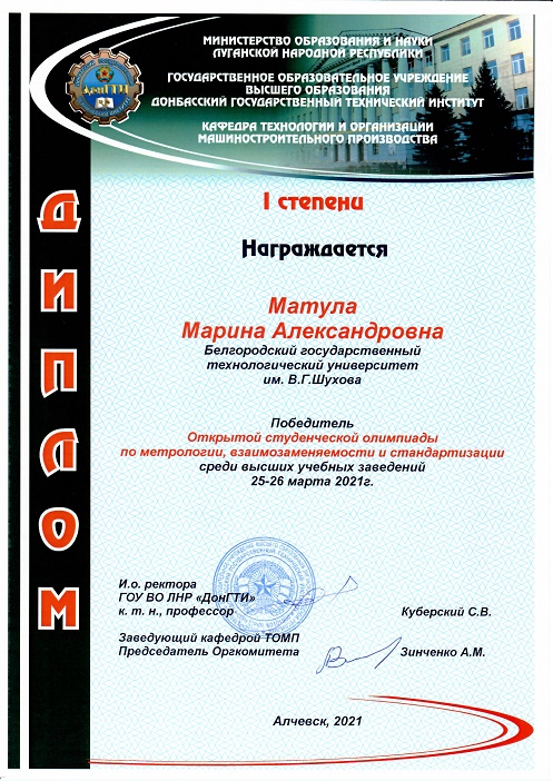 25.03.2021 состоялась Открытая студенческая олимпиада по дисциплине «Метрология, взаимозаменяемость и стандартизация» организованная в ГОУ ВО ЛНР «ДонГТИ» на кафедре «Технология и организация машиностроительного производства» в дистанционном режиме.