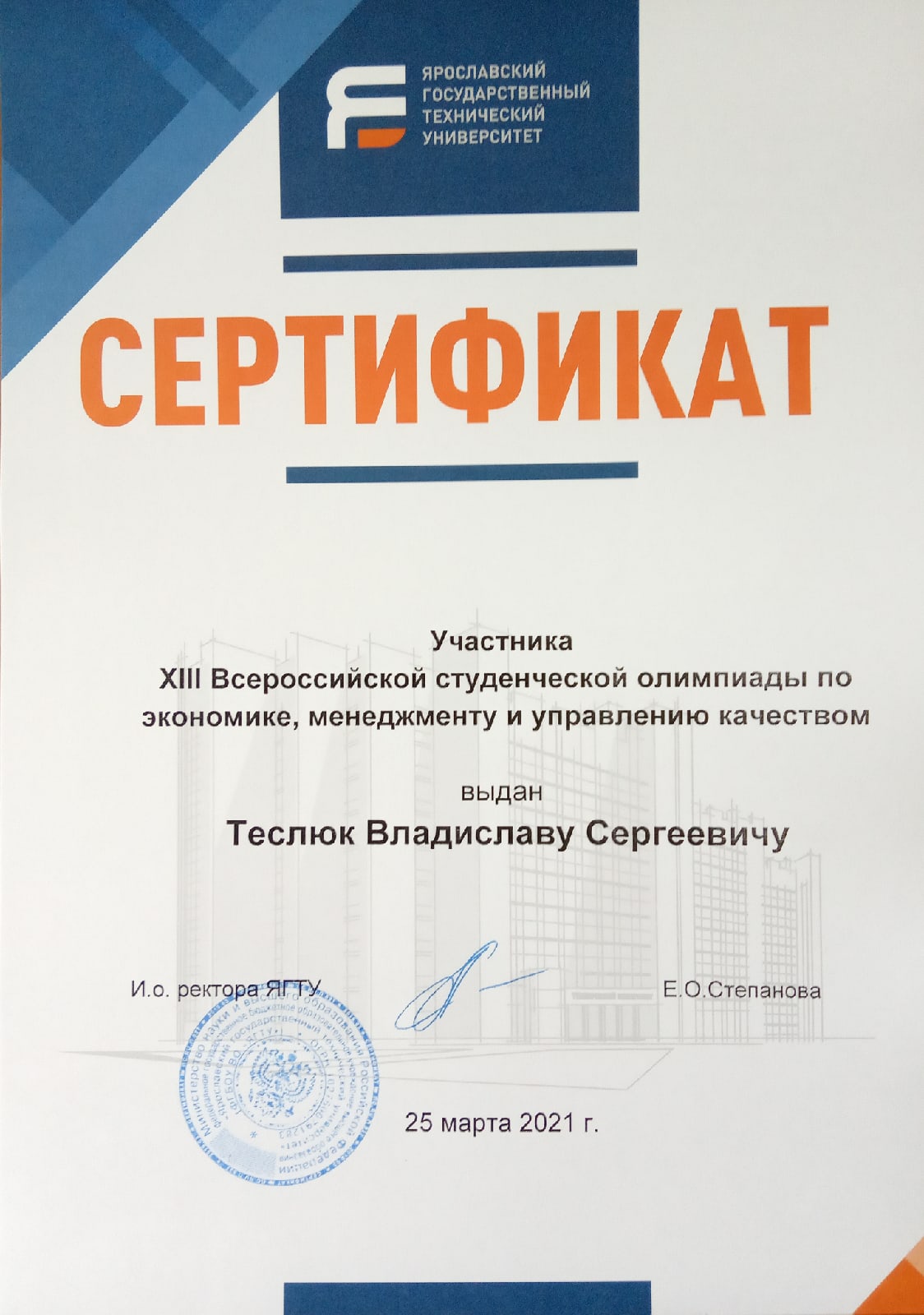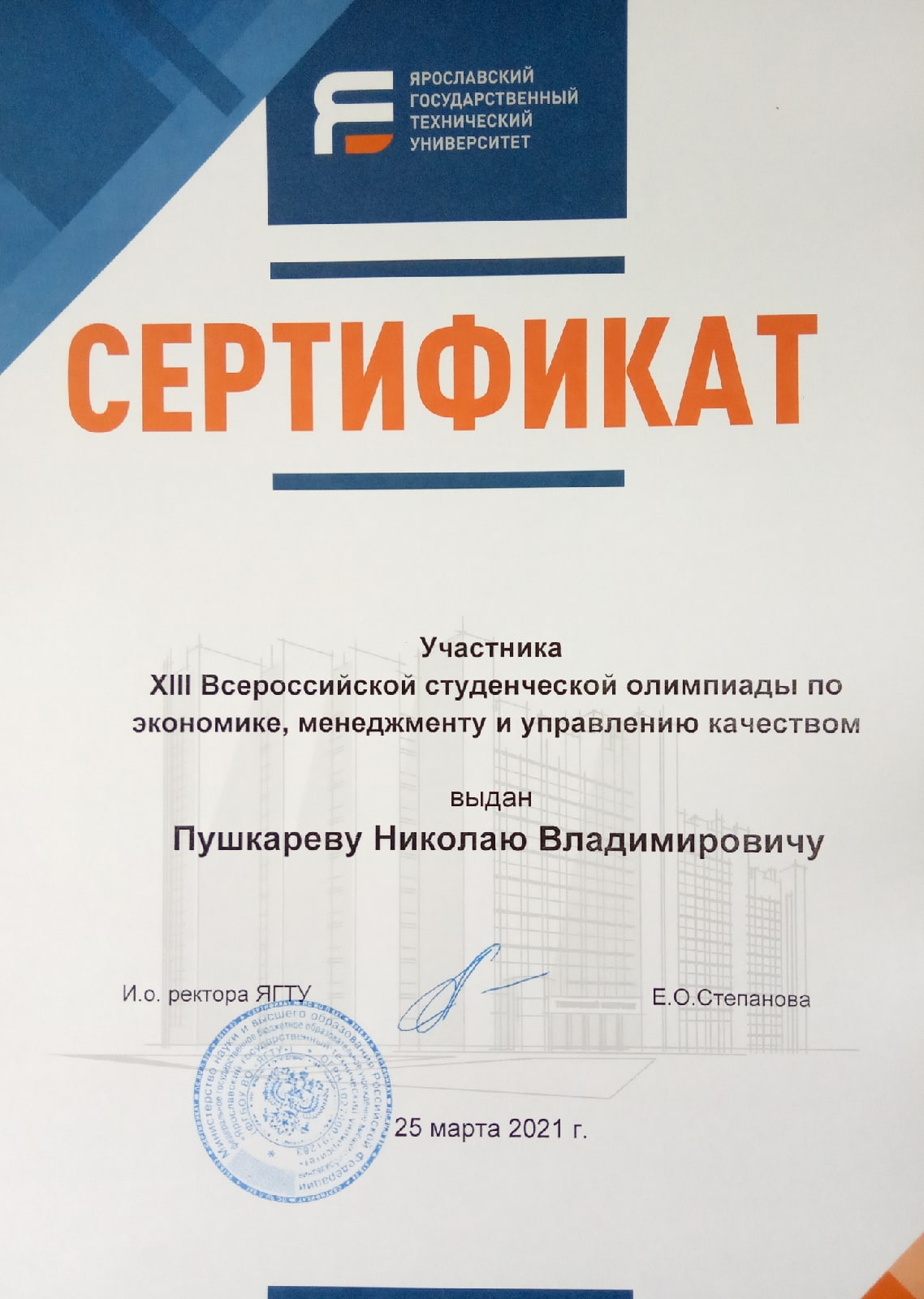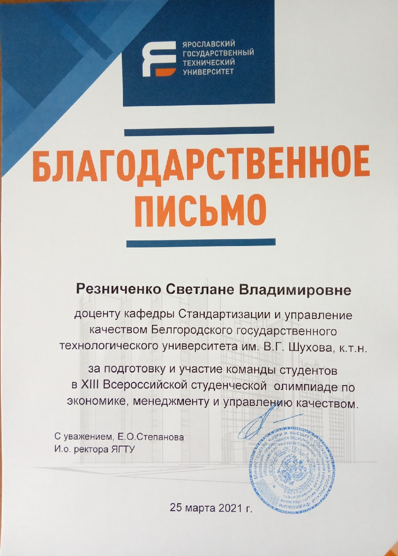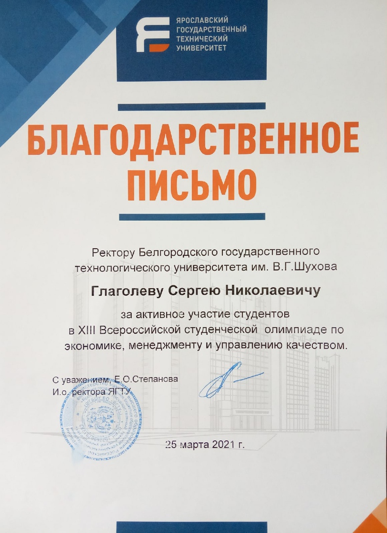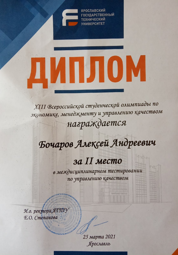Стали известны итоги Всероссийской студенческой олимпиады «Экономика, менеджмент и управлению качеством», которая прошла в в Ярославском государственном техническом университете 25 марта 2021 года.