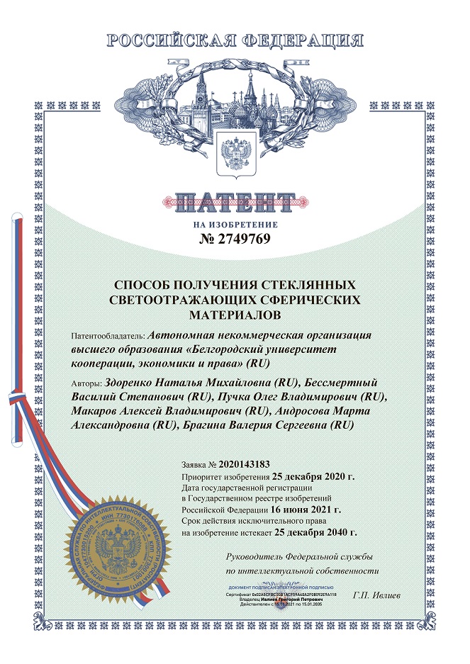 - Патент «Способ получения стеклянных светоотражающих сферических материалов»