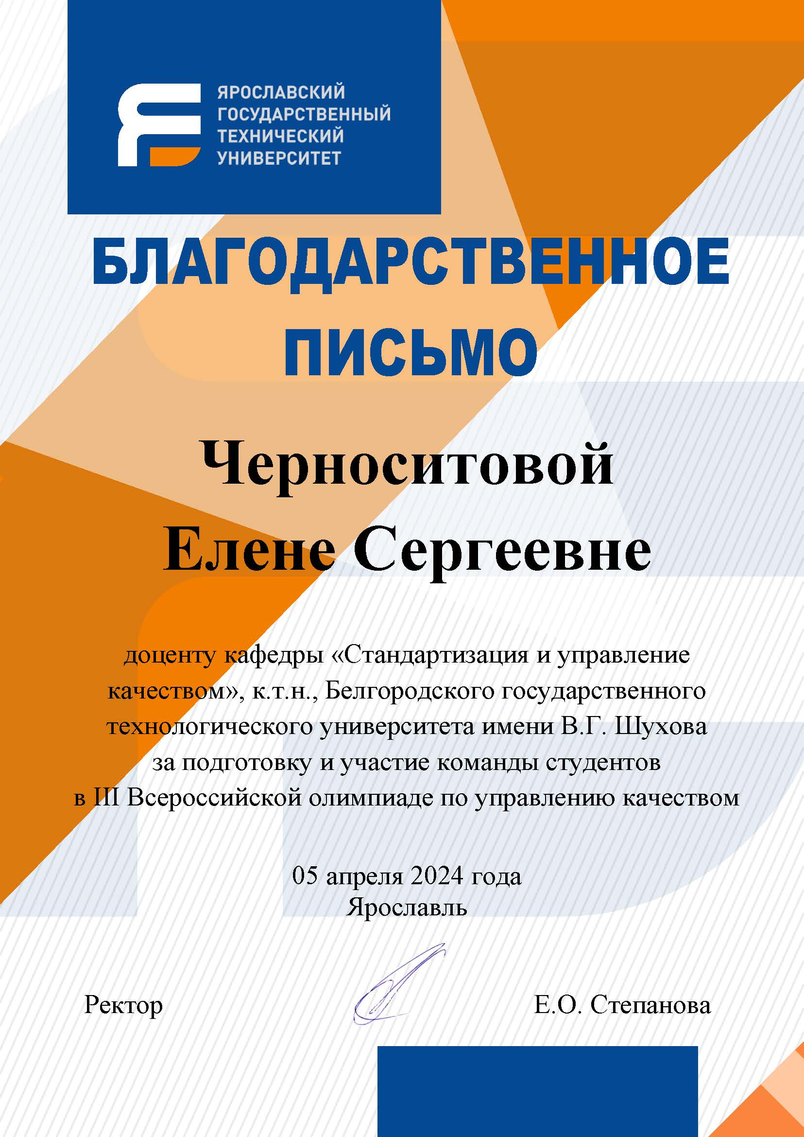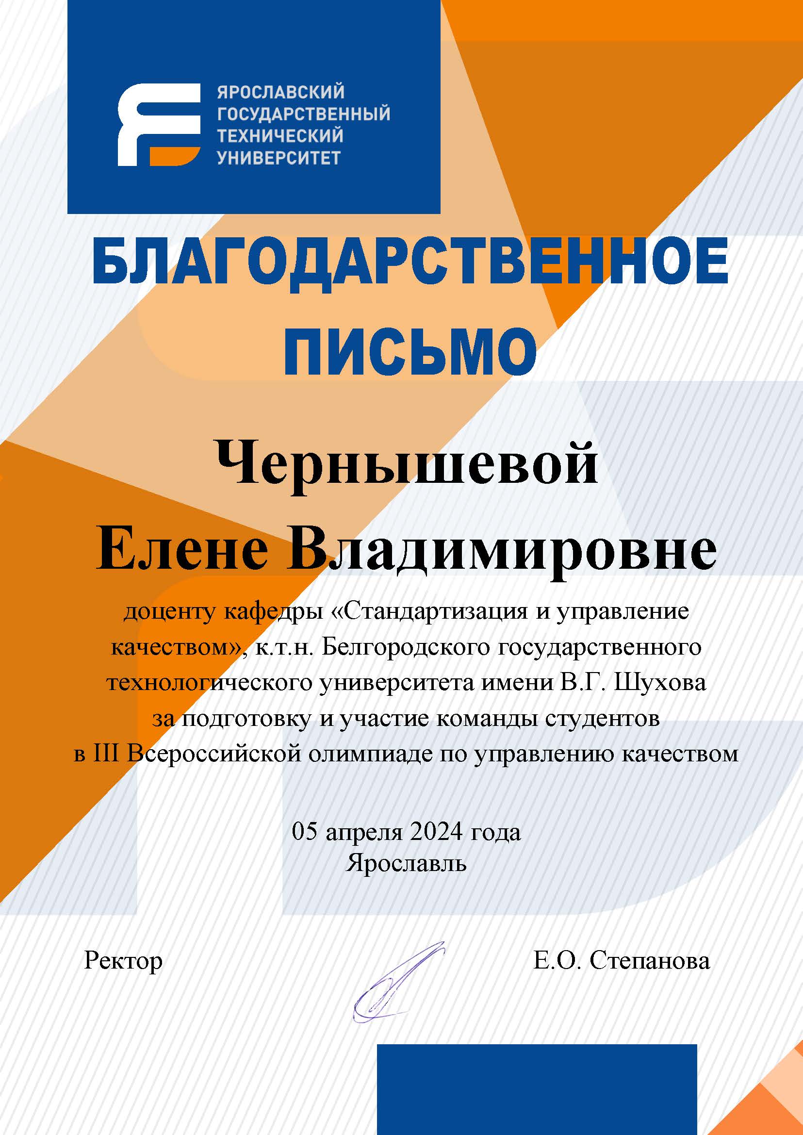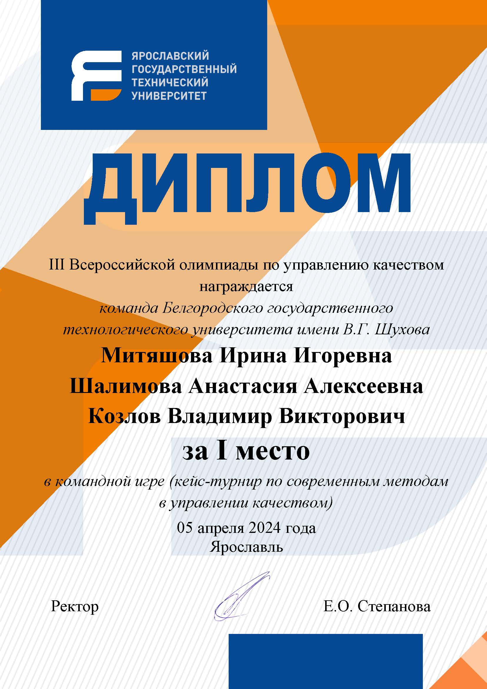 Команда Белгородского государственного технологического университета им. В.Г. Шухова» кафедры «Стандартизация и управление качеством» (Митяшова И.И.; Шалимова А.А.; Козлов В.В., руководители – к.т.н., доцент Чернышёва Е.В.; к.т.н. доцент Черноситова Е.С.) заняли 1-е место, в номинациях: «Кейс - турнир по современным методам в управлении качеством», и в «Итоговой» по сумме двух этапов.